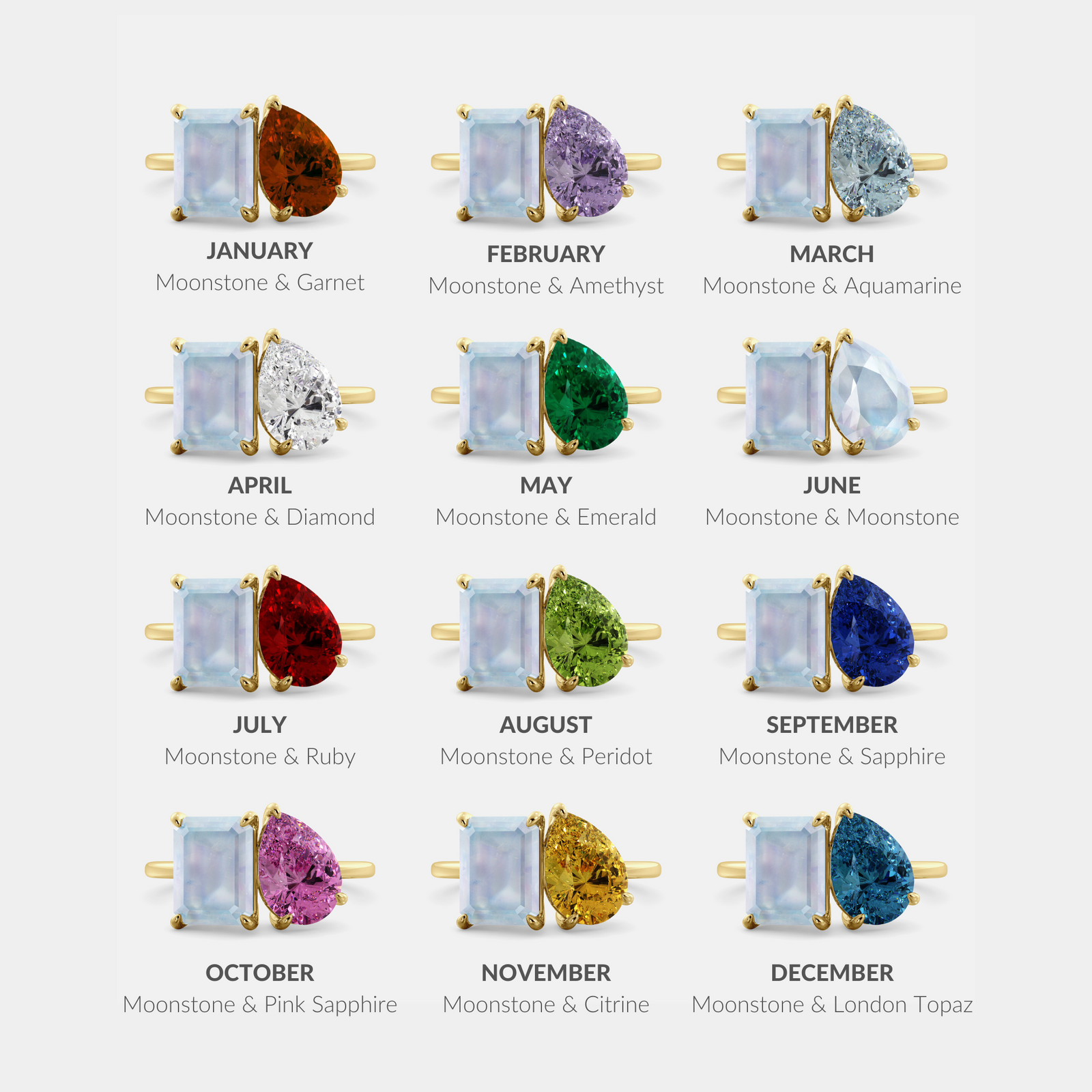 Moonstone’s ethereal glow blends beautifully with all twelve birthstones in our Toi et Moi collection, from the deep blues of London Blue Topaz and Sapphire to the warm radiance of Citrine and Ruby. Each pairing highlights Moonstone’s soft, dreamy elegance in a distinct way.